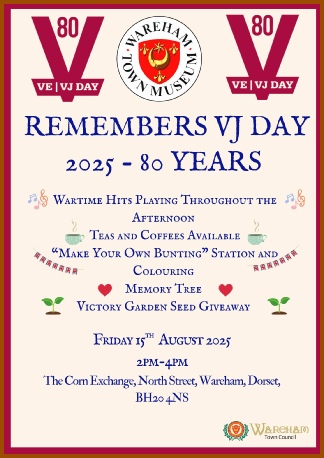 Join Wareham Town Museum and Wareham Town Council as we mark VJ Day with a special afternoon of remembrance and celebration on Thursday 15th August, from 2–4pm at the Corn Exchange.